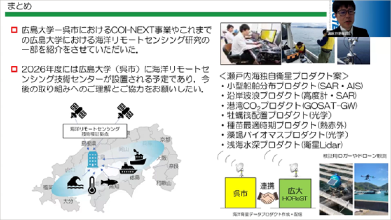 本日ご紹介した研究を礎に、大学から瀬戸内海独自の衛星プロダクトを発信するため、呉市で様々な取り組みを行っています。また、2026年には、呉市の広島大学に海洋リモートセンシング技術センターを設置する予定です。