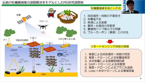 まずは、造船、海運、カキ養殖という呉の三大産業を盛り上げるためにリモートセンシングが役立てる、4つのテーマをあげています。一つ目が、「みちびき」などを利用した無人運航船の技術開発です。二つ目は、事故が多発する傾向にあるカキ筏やプレジャーボードの多い場所を、小型の合成開口レーダーを使って常にモニターする取り組みです。三つ目が、スイッチ音響やドローンを利用したカキの生育診断です。最後に、RRI(Responsible Research and Innovation)に基づくリモセン技術の社会実装に向けた未来競争です。呉は歴史上軍事的な意味合いも持った場所ですし、倫理の先生に参画いただき技術倫理の話も加えています。