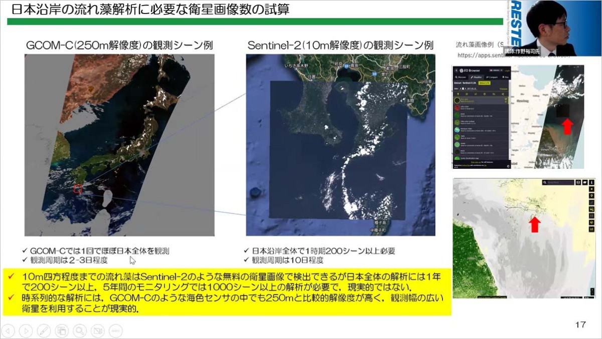当初はSentinel-2やLandsatの他に高解像度のデータを利用するつもりでしたが、(経済性や観測頻度などの)検討の結果、GCOM-Cを利用しました。実際にEO BrowserでNDVIを見ると、きちんとそれらしきものは観測できています。本当に流れ藻かと最初は半信半疑でしたが、鹿児島大学等と研究を進めた結果、流れ藻であるという確認ができました。つまり、高解像度ではないGCOM-Cでも、ある程度集団であれば平均値のような数値が出るのです。