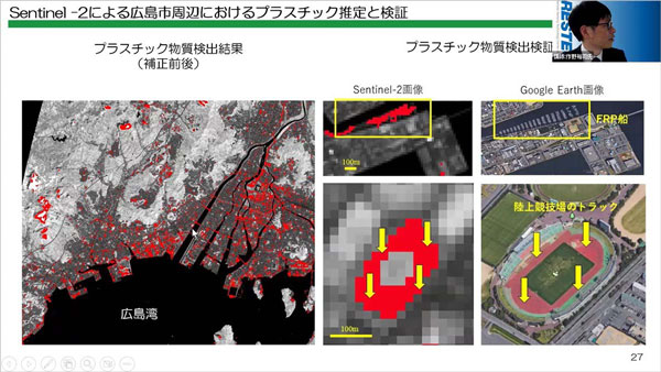 現在は、海岸の波打ち際に打ち上げられているゴミを、自治体が掬い取って、顕微鏡でプラスチックの割合を確認しています。これを自動で測定できるようにしたいと考えています。そのために、NDVI指標のようにプラスチックインデックスを作っています。広島市内の陸上で検出した例では、FRP製の船舶やプラスチック製の陸上競技場のトラックも赤色で検出されており、技術的にはある程度手ごたえを感じています。 ただ、近赤外は水の反射はほぼゼロになってしまうことから水をかぶる海上では検出が難しいことなど、いろいろな問題はあります。しかし、海中は難しくても波打ち際のモニタリングなら頑張ればできるところまできています。