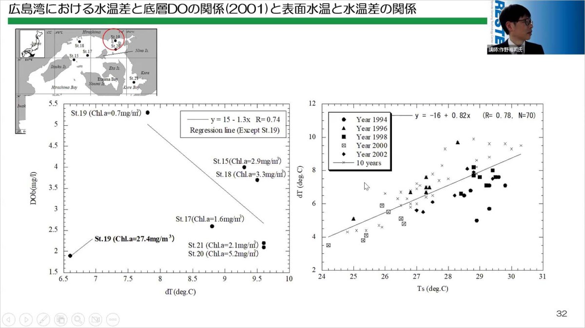 「広島湾における夏季の水温とDO(溶存酸素)の関係」です。昨今、養殖カキの死滅が大問題になっていますが、要因の一つとして、底層の貧酸素が上がったことによってカキが死滅したのではないかと地元では言われています。東京湾でいう青潮のような状態です。