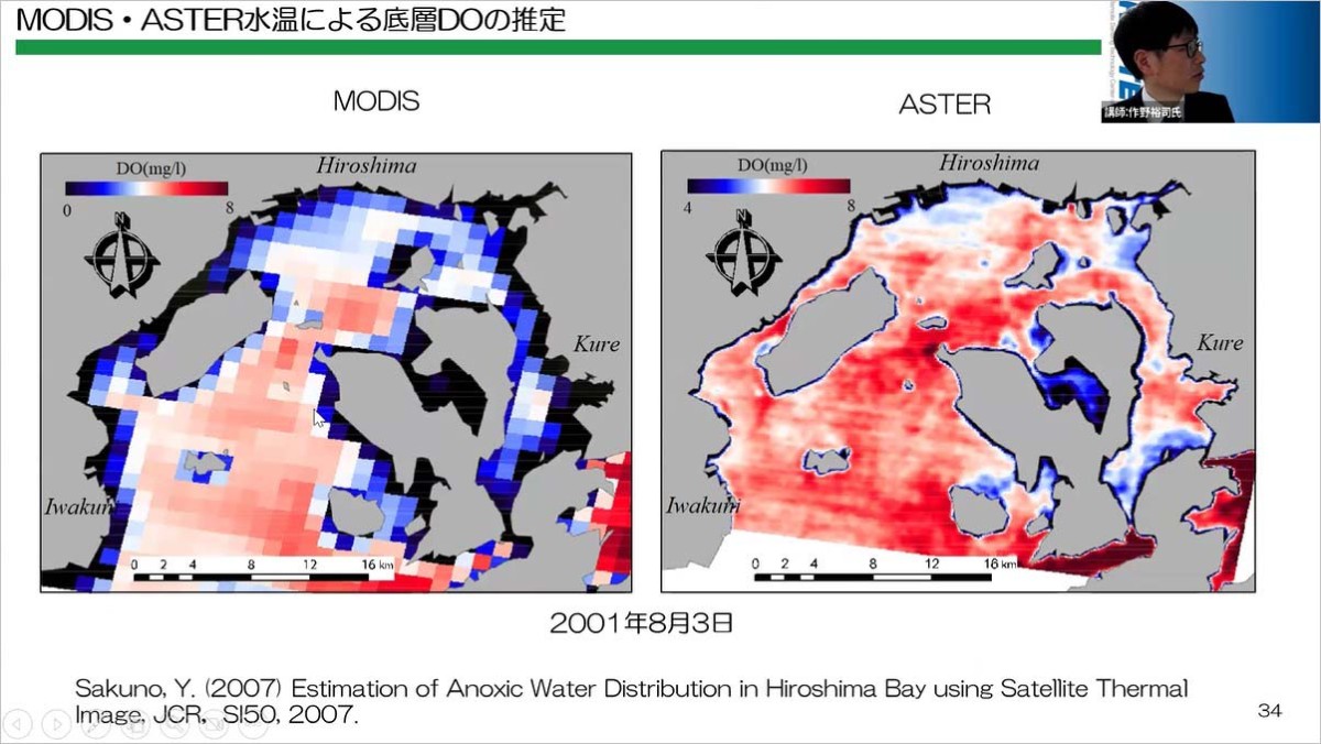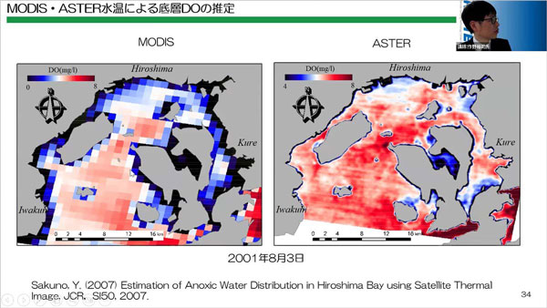 MODISとASTER、それぞれのデータの解析結果を示します。貧酸素になりがちなところを青色で示しています。ASTERの結果で青い箇所の養殖棚は、確かに貧酸素になりやすいとわかります。このように、たとえ衛星からその地点の情報がわからなくても、様々なマッピングによって多くのことがわかりそうです。 -