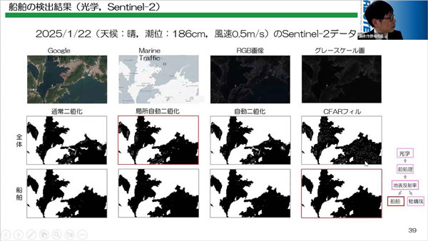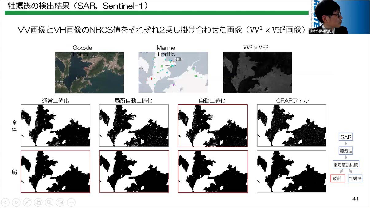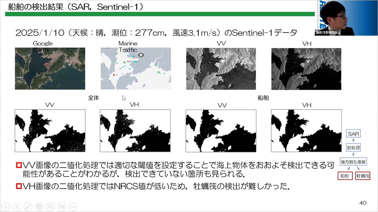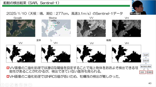 他には、衛星データを利用した小型船舶や筏の検出も実施しています。こちらは、光学とSARそれぞれで取り組んでいます。これは、どのように二値化するかがカギとなります。自動二値化でよく用いられるCFARフィルターを用いてカキ筏がどう検出できるか実施した結果、かなり細かい船も検出できそう なことがわかりました。一方、検出できていない場所を実際に検証すると、船や筏ではないこともわかりました。自動化までは、なかなか難しいところです。
