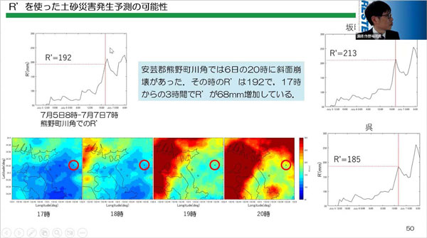 R’を使った土砂災害発生予測として、西日本豪雨の際に広島県で被害が発生した安芸郡熊野町川角の例を示します。赤い丸の箇所が川角です。3時間前には、土砂災害の危険度を示す赤色はありませんでしたが、2時間前、1時間前には赤色が周辺に迫り、発災時には周囲を囲まれていました。この時の数値を確認すると、ちょうど最初のピークのところで災害が起きています。これを用いれば、大体1時間から2時間前ぐらいにやってくる急激なピークで、地点ごとにアラートを流すことができると考えています。西日本豪雨の際、アラートを流して避難しないことが課題としてわかりました。そこで、「確実に土砂災害が起きますよ。」というような、より確度の高い情報を流そうと進めています。