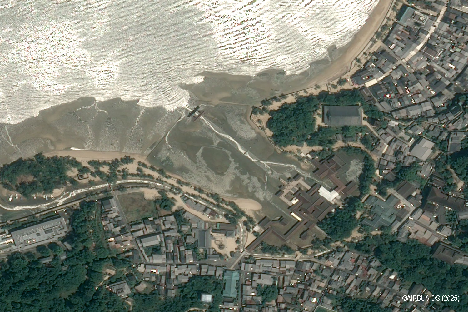 海上に建つ社殿と大鳥居は、日本の伝統建築と信仰の象徴として多くの人々を魅了しています。宇宙からの視点では、周囲の自然と調和した大鳥居の壮大さが際立ち、宮島が「神の島」と称される理由が実感できます。