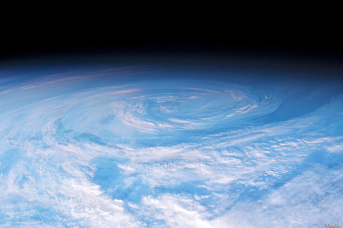 2025年最後にお届けする画像は、南太平洋上空を周回中のISSから撮影されたものです。日の出直前の太陽光が円形の雲を赤やピンクに染め、幻想的な光景を写しています。地球の昼側と夜側を分ける明暗境界線付近では、光と影が雲の高さや円運動を際立たせます。この画像は宇宙飛行士が夜側を振り返って撮影したため、境界に近づくほど雲がぼやけて見えます。