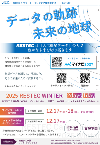 本年度は、「ウィンター2days」(仕事体験)、「ウィンター1day」(WEBオープン・カンパニー)の2コースで、衛星データで何が分かるか、どんなことに活用されているのか具体的な利用事例などを交えたご紹介や、グループワークを通して、衛星データを活用したビジネスについて体感していただけるプログラムを予定しております。